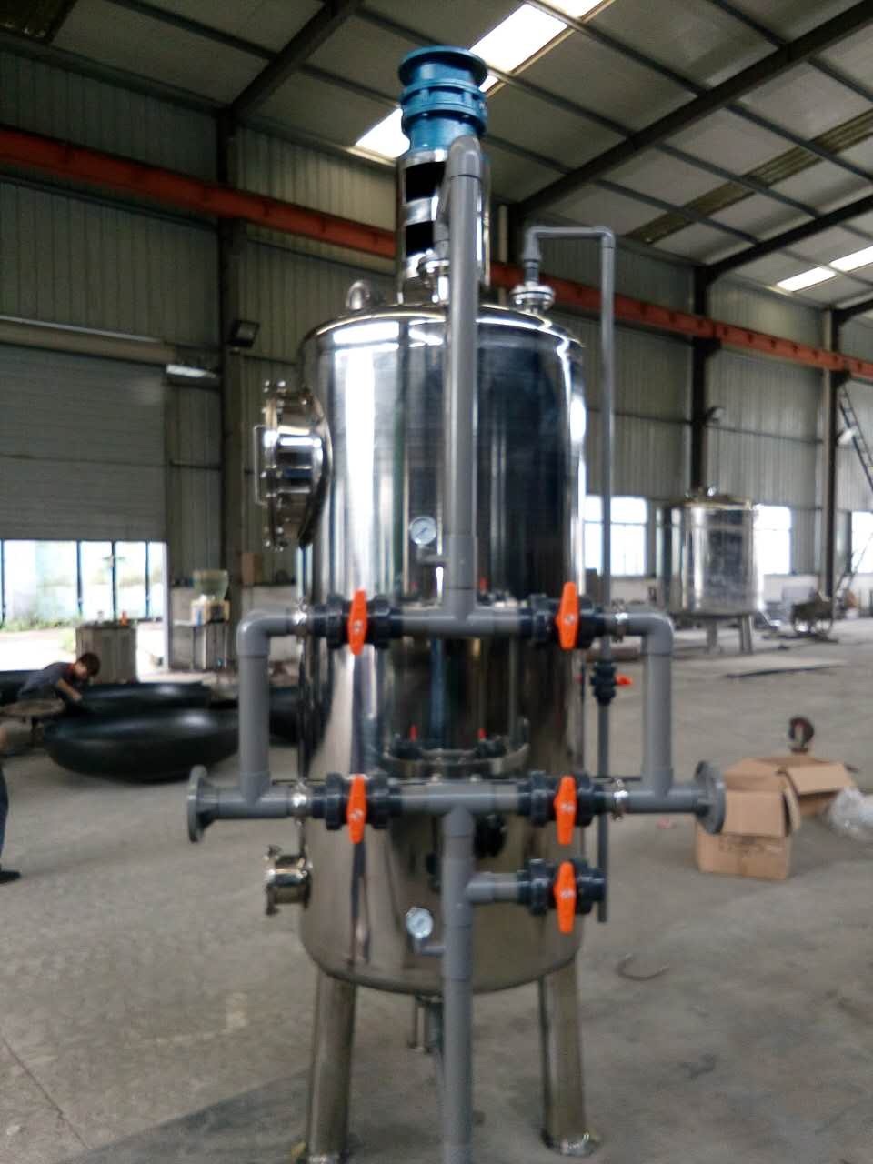 纖維束過濾器有碳鋼和不銹鋼材質(zhì),過濾器設(shè)備由固定多孔板、活動多孔板、纖維束濾料、布氣裝置等組成。活動多孔板可上下移動,過濾時,在水力作用下,濾料順水流方向空隙由大逐漸變小,纖維密度變大,形成理想的過濾層面,其過濾過程既有縱向深層過濾,又有橫向深層過濾,有效地提高了過濾精度和過濾速度;清洗時,使纖維束達到疏松狀態(tài),同時,采用氣水合洗的方法,在氣泡聚散和水力沖洗過程中,纖維束處于不斷抖動狀態(tài),在水力和上升氣泡的作用下,反沖洗濾料而使其再生。